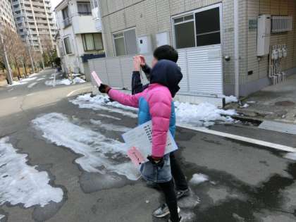 通学路の安全な場所、危険な場所をデジカメで撮影している様子です。