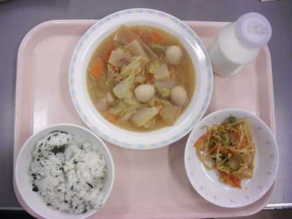 今日の献立は「わかめご飯・牛乳・豚肉と大根のうま煮・もやしのコチュジャンかけ」です。