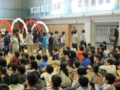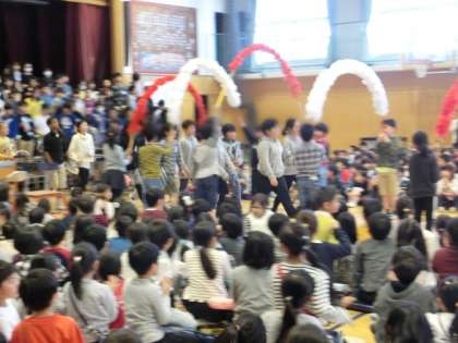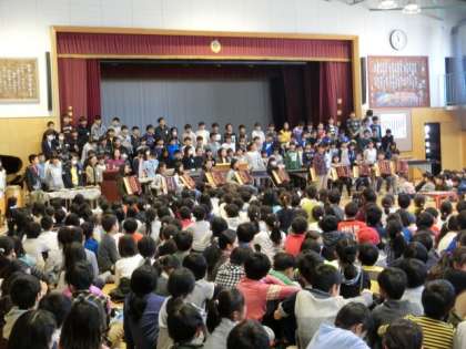 給食の時間は、6年生と各学年が一緒に過ごします。