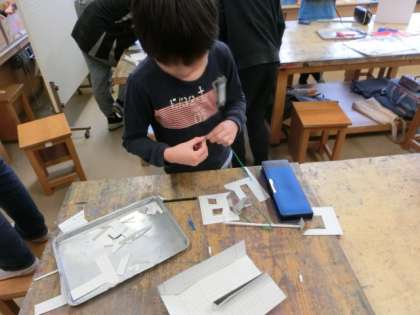 ミラクルミラーステージの制作が終わった児童は、ビー玉を使ったおもちゃ作りを行っています。