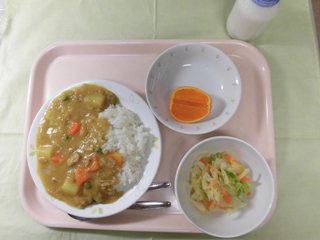 今日の給食は、カレーライス、牛乳、キャベツサラダ、くだものは「なつみ」というみかんでした。