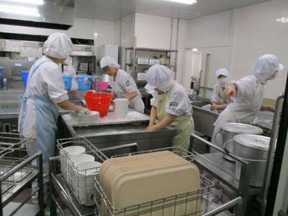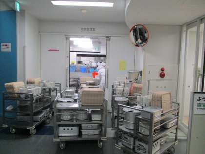給食室の様子です。朝早くから約800人分の給食を作り、その片付けを毎日してくださっています。いつもおいしい給食をありがとうございます。
