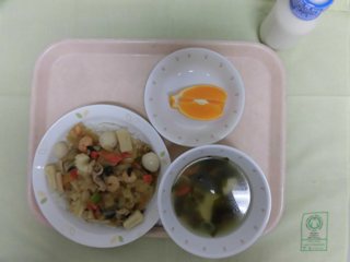 今日の給食は、中華丼、牛乳、わかめスープ、くだものはデコポンでした。中華丼には、11種類の具が入っていました。うずらのたまごは子どもたちに大人気でした。