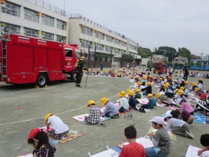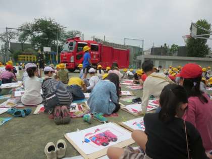 1・2年生約275名で、大きな画用紙いっぱいに、車や消防士さんの絵をクレパスで描きました。図工の中水先生や、担任の先生に教わる子どもたちや2年生のよいところを真似して描いている1年生もおり、仲良く進めることができました。できた作品は、教室前に掲示する予定です。玉川消防署のみなさん、地域の消防団のみなさん、ありがとうございました。