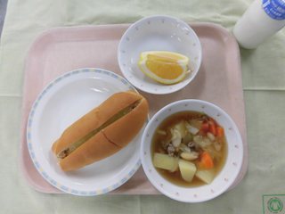 今日の給食は、ホットツナサンド、牛乳、白いんげんのスープ、くだもの(河内晩柑)でした。やわらかいパンに、ツナとチーズがよく合いました。おかわりをねらう子どもたちもたくさんいました。