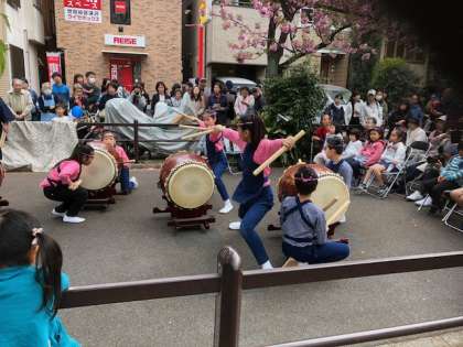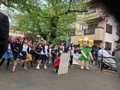 葉桜の緑が瑞々しく風になびく中、本校の子どもたちは勇ましく太鼓を演奏したりリズミカルに踊ったりして活躍しました。お休みでしたが教職員も子どもたちの晴れ姿を一目見ようと連れだって繰り出しました。