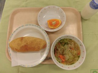 今日の給食は、きなこ揚げパン、牛乳、肉団子スープ、くだもの(セミノール)でした。肉団子スープは、肉団子より野菜を好んで食べる子も多かったです。