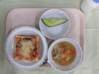 今日の給食は、ピザトースト、牛乳、ひよこ豆のスープ、くだものはメロンでした。ピザトーストは、やわらかいパンにたっぷりのチーズといろいろな具がのっていて、大人気でした。