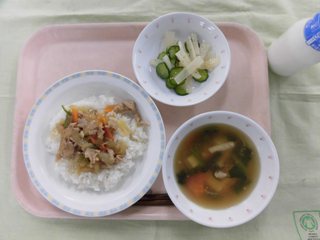 今日の給食は、スタミナ丼、牛乳、豆腐汁、きゅうりと大根のごま風味でした。今日のお昼の放送では、運動会の紅組・白組応援団の、団長インタビューがありました。スタミナ丼を食べて元気を蓄え、みんなでよい運動会にしましょう。