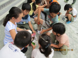 2年生が、トマトのお世話をしていました。3年生は、ヒマワリとホウセンカを育てるために、土の準備をしていました。