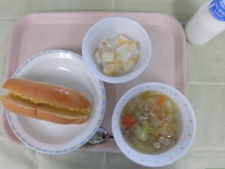 チーズとコーンのサンドパン、牛乳、野菜スープ、フルーツのヨーグルトがけでした。フルーツのヨーグルトがけは、フルーツの甘さとヨーグルトの酸味がとてもよく合っていて、おいしかったです。