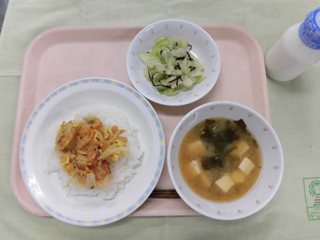 今日の給食は、かきあげ丼、牛乳、みそ汁、キャベツの塩昆布あえでした。かきあげ丼のかきあげには、大豆やごぼうなどかたい食材がたくさん含まれていたので、よく噛んで食べることにつながりました。