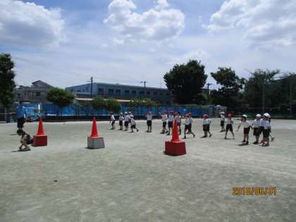 体力テストの時期になりました。ソフトボール投げや反復横とび、シャトルランなど、いろいろな種目があります。今日は2年生がソフトボール投げに向けて練習をしていました。