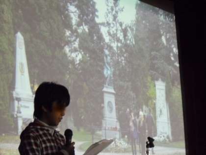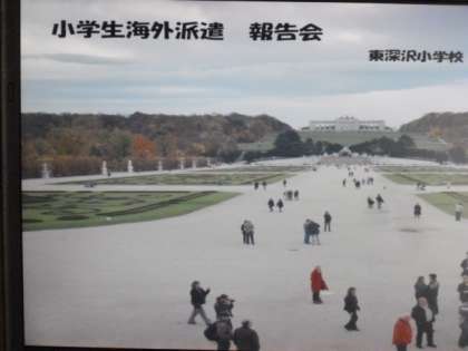 今日の全校朝会では、オーストリアに世田谷区の派遣生として参加した5年生の報告会をしました。派遣から帰国して1週間でプレゼンテーションや掲示物を作成し、全校の前で発表しました。オーストリアの人との交流のほか、同じ派遣生と協力して生活したことがとても思い出に残ったようです。発表の態度も、発表を聴く在校生の態度も立派でした。