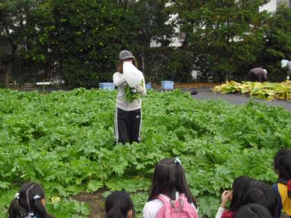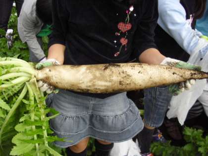 午前中に秋山農園にお邪魔して大根抜きをさせていただきました。今年の夏はとても暑かったため大根の生育も十分でないとのことでした。しかし、写真のように大きな大根を収穫した子どももいました。「どんな料理になるのかな〜?」とお家で料理してもらうのを楽しみに帰宅しました。今日の夕飯は、おでん? お鍋?・・おいしく召し上がってください。(3年担任 鍛田)