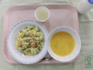 今日の給食は、パエリア風ピラフ、牛乳、キャロットポタージュ、アップルゼリーでした。キャロットポタージュにはにんじんがたっぷり使われていて、やさしい甘さが感じられました。