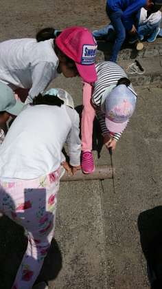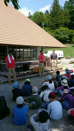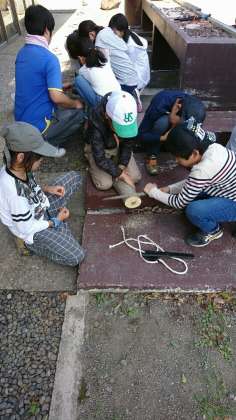 宿舎にもとり、アイスクリームを食べました。丸太を使ってのコースターつくりが始まっています。