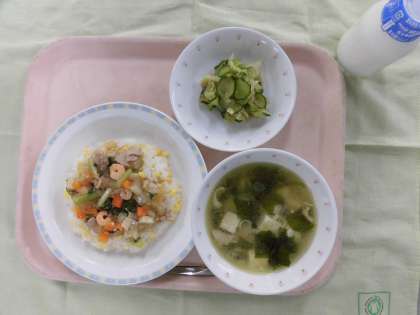 今日の給食は、あんかけチャーハン、牛乳、わかめスープ、野菜の中華風味でした。あんかけチャーハンのご飯には卵が混ざっていて、彩りもきれいでした。