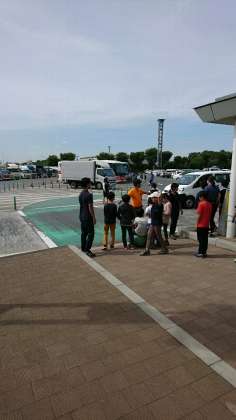 三芳パーキングエリアを14時20分出発しました。バス会社によると学校到着予定時間は15 時 50 分です。
