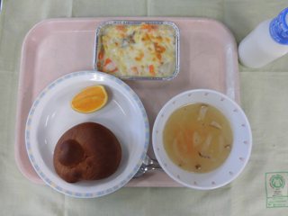 今日の給食は、黒砂糖パン、牛乳、マカロニグラタン、コンソメスープ、くだものはバレンシアオレンジでした。黒砂糖パンはそのままでもおいしく食べられましたが、スープやグラタンと合わせて食べると、バランスがよかったです。