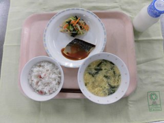 今日の給食は、梅じゃこごはん、牛乳、魚のごまだれかけ、おひたし、にらたま汁でした。魚のごまだれかけは、魚を食べ終わってもごまだれだけおかわりする子がいるほど人気でした。