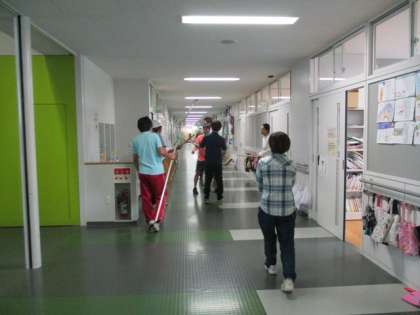 今日の避難訓練は、不審者が校内に侵入した場合の訓練でした。教室では物音をたてないようにし、窓ガラスには不審者から見えないように目隠しをします。不審者がいる現場には、主事さんや各学年の現場対応の先生方が急行し、不審者を取り押さえるためのさすまたや武器をもって対応にあたりました。