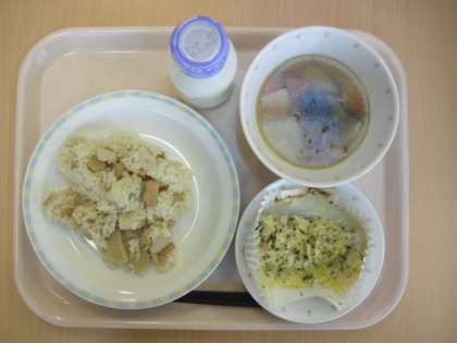 献立は、里芋ごはん、魚のマヨネーズ焼き、カブのスープ、牛乳です。おいしい給食に皆さんも笑顔でした。ありがとうございます。