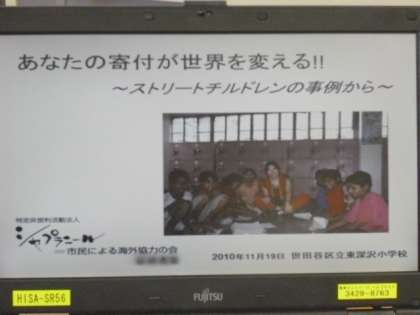 シャプラニールとは、バングラディッシュの言葉で「睡蓮の家」という意味だそうです。睡蓮はバングラディッシュの国花だそうです。日本で言うと「桜」です。このシャプラニールは、バングラディッシュのストリートチルドレンを支援しています。私たちの集めたアルミ缶で、バングラディシュの子どもたちの自立の手助けをしているそうです。今日は、私たちの活動の成果がはっきりわかり嬉しかったです。ありがとうございました。