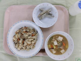 今日の給食は、ひじきごはん、牛乳、小魚のから揚げ、さつま汁でした。さつま汁入っているさつまいもが甘くておいしかったです。