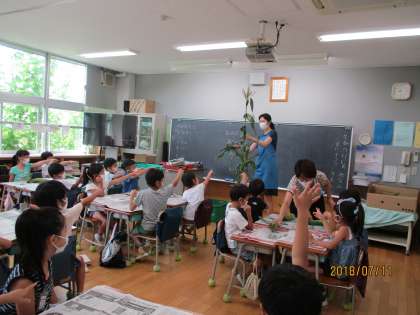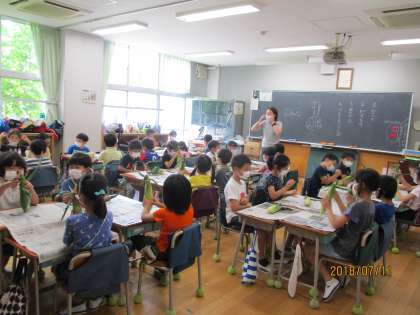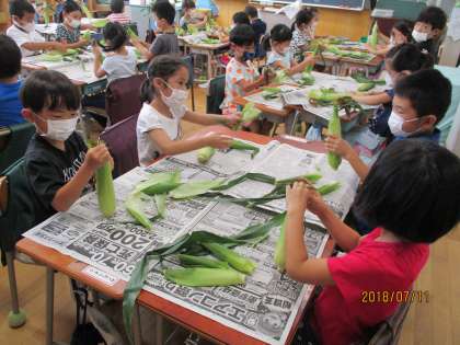 全校分の給食用トウモロコシの皮むきを1年生が行いました。自分たちでむいたトウモロコシが本当に調理されると知り、子供たちは手をきれいに洗ってマスクをして、真剣に取り組みました。