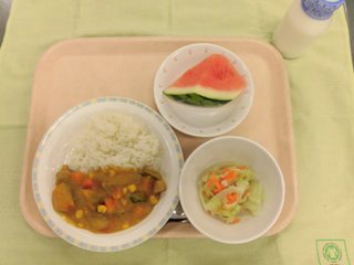 今日の給食は夏野菜のカレー、牛乳、キャベツサラダ、果物はすいかでした。今日は1学期最後の給食でした。毎日おいしい給食を作ってくださった調理員さん、ありがとうございます。