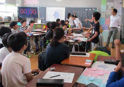 今年度、本校では校内研究として「学級力向上プロジェクト」に取り組みます。自分たちの学級の様子をアンケートをもとにレーダーチャートで視覚化し、児童が主体的に、自分たちの学級をよりよくするための方策を話し合っていました。