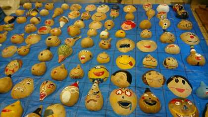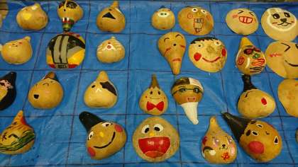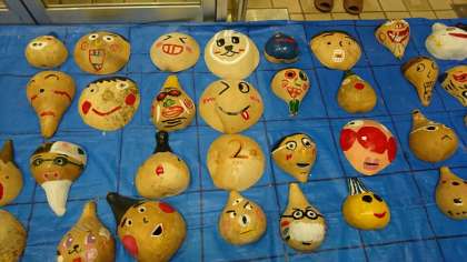 まもなく、ふくべ 細工の作業か終了します。写真は児童のふくべ細工の作品、お面の数々です。