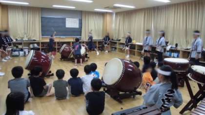 こざくらの皆さんに盆太鼓の打ち方を習いました。模範演技をみんな真剣に見ています。グループに分かれて練習しました。