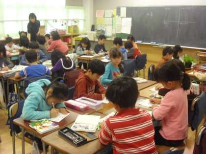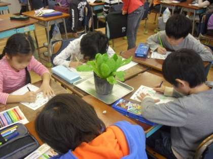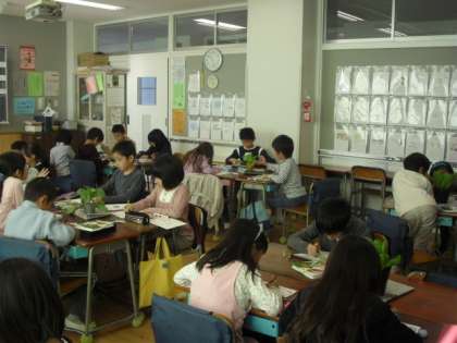 2年生の教室では、これから育てる野菜を観察しています。白菜の葉っぱはどんな形かな?ブロッコリーの葉っぱの色は?と子どもたちは目を凝らして野菜とにらめっこです。