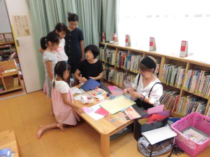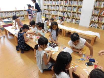 絵本室のミニミニワークショップ、たくさんの児童でにぎわっていました。