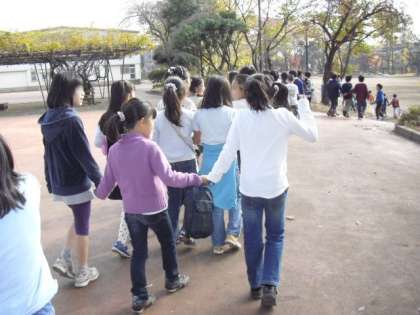 皆でしっぽ取りゲームをしたときにはもうすっかり仲良しです。仲良く手をつなぐ姿に笑みがこぼれます。最後は、お友達のアーチに送られて学校に戻りました。