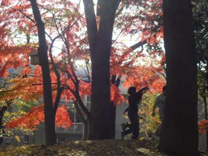 たくさんのグループに分かれ、グループごとに自己紹介をして交流が始まりました。今回は附属世田谷小学校のお友達がトランプやイス取りゲーム、バランスゲームなどを用意してくれました。校庭にある紅葉のきれいな「どんぐり山」で鬼ごっこもしました。