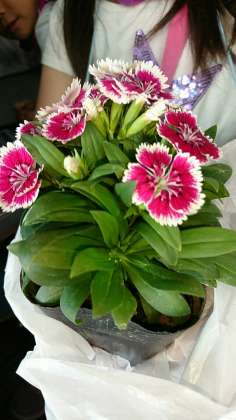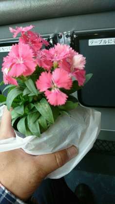 世田谷市場を出発しました。学校へ向かいます。お土産の花を一人一人いただきました。到着予定じかんは、15時50分過ぎを予定しています。