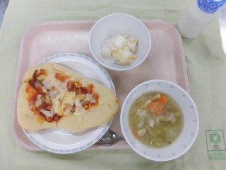 今日の給食は、ナンピザ、牛乳、マカロニスープ、フルーツのヨーグルトあえでした。給食に初めてナンが出ました。子どもたちは、パンとは違うナンの食感を感じながらおいしそうに食べていました。