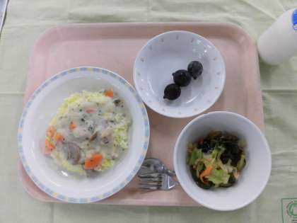 今日の給食は、バターライスのきのこソースがけ、わかめサラダ、くだもの(巨峰)、牛乳でした。きのこ嫌いの児童も、「このご飯なら食べられる!」とモリモリ食べていました。