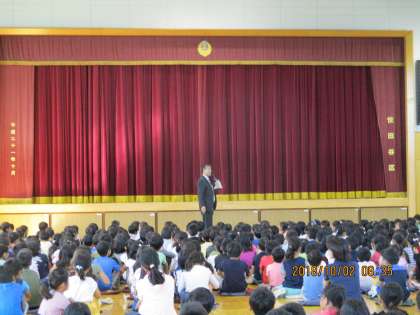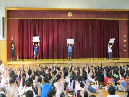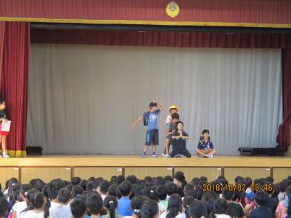 明日の開校記念日を前に、記念集会を実施しました。校長先生が、69周年を迎える本校の歴史を話すのを集中して真剣に聴いていました。その後、高学年の集会委員が企画したクイズをしました。本校にちなんだ楽しいクイズを、1〜6年生、そして先生方、皆で楽しみました。