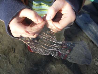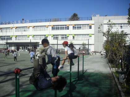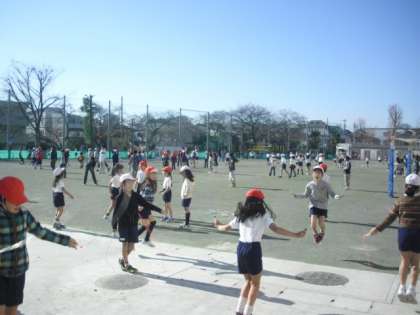 子どもは風の子。この冬一番の寒さでも中休みは校庭で遊びます。一人の子は校庭の砂場にかけたシートの上から氷を見つけて持ってきました。冷たい鉄棒でもしっかり握って、ぐるりぐるりとまわる子もいます。なわ跳びは、今やひがしの定番の遊びです。