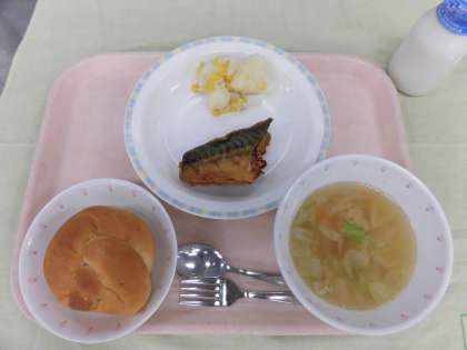 今日の給食は、ぶどうパン、牛乳、さばのカレー揚げ、コーンポテト、キャベツスープでした。さばは脂が乗っていました。カレーの味が付いていると食が進むので不思議です。
