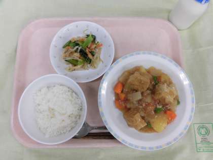 今日の給食は、ごはん、牛乳、生揚げのそぼろ煮、おひたしでした。生揚げが大きくとても食べ応えがありました。とろりとしたあんとよくからんでいました。