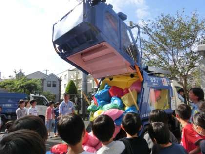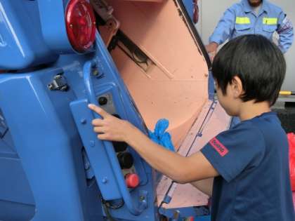 実際に清掃スケルトン車にごみを入れる体験もしました。子どもたちは、清掃車にごみが取り込まれる様子に驚いていました。
