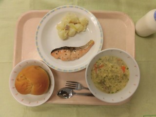 今日の給食は、あしたばパン、牛乳、魚のハーブ焼き、ジャーマンポテト、イタリアンスープでした。ハーブの香りと鮭の香ばしさが相まってとてもおいしかったです。