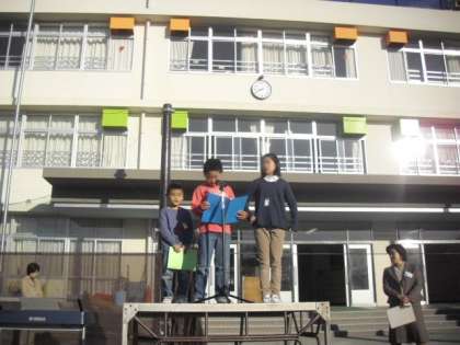 「今日は、担任の先生方から通知表をいただきます。校長先生も副校長先生も全員の通知表をみました。2学期にがんばったこと、もう少しがんばれば良かったことが記入してあります。通知表を見てお家に人と話し合って、2学期のがんばりをもう一度振り返りましょう。