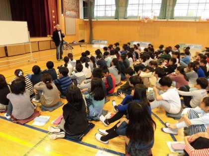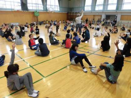 学芸会に向けて、演技や表現について学びました。講師に演出家の若倉雅貴さんを招き、姿勢のよい歩き方や、体の中で声を共鳴させる方法など、プロの俳優と同じ訓練を受けました。また、「ダバダバ」という言葉だけで思い出を伝えたり、目で好きな果物を伝えたりして、全身で表現することを学びました。