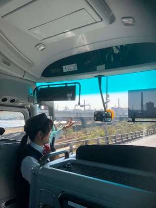 昼食後、バスで2つ目の見学場所に向かっています。海沿いに大規模な工場が